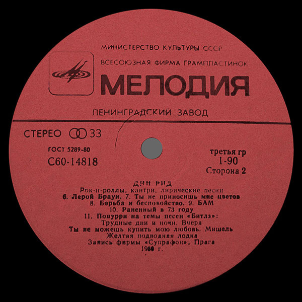 Records with labels of var. white-1, var. white-2, var. red-1, var. red-2 (carrying 1980 All-Union State Standard and price 1-90) were released between 1980 and February 1, 1983.