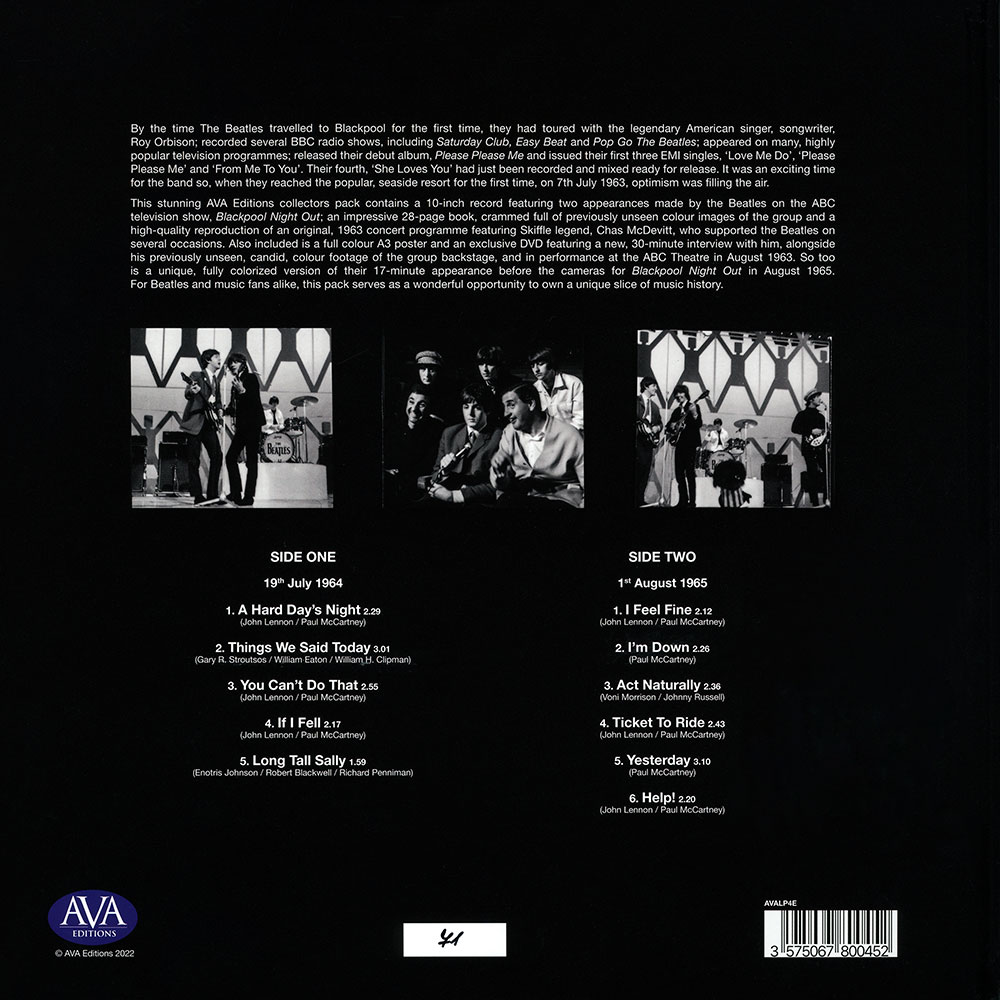 In addition to recording The Beatles performance on Blackpool Night Out on August 1, 1965, it also includes a new 30-minute interview with Chas McDevitt recorded in 2019, previously unseen footage of The Beatles performance at the ABC Theater in August 1963 plus behind the scenes (silent movie).