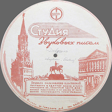 Pic. 1.1-1. One-sided flexible 9.2" (23.4 cm) record made of X-ray film (both sides are shown) with the song Roll Over Beethoven by The Beatles (the song's title and artists are listed by hand both in English and Russian – as Рубейгувен Shake and Rubayguven Shake, Beatles). Some members of the band are also quite peculiarly written: Pol Makartney, Ringo Star, John Lennon, Jordj Garrison. The remaining part of the label on the working side of the record says that it was cut, and quite officially, definitely in the Moscow Sound-Recording Studio at the address: Gorky street, 4. In all appearances, the record dates back to the mid-60s. Rotation speed Рис. 1.1-1. Односторонняя гибкая пластинка, сделанная из рентгеновской плёнки диаметром 23,4 см (показаны обе стороны), с песней Roll Over Beethoven в исполнении "Битлз" (название песни и исполнитель указаны на пластинке от руки одновременно по-английски и по-русски – как Рубейгувен Shake и Rubayguven Shake, Beatles). Также довольно своеобразно написаны имена и фамилии некоторых участников ансамбля: Pol Makartney, Ringo Star, John Lennon, Jordj Garrison. Сохранившаяся часть этикетки на рабочей стороне пластинки говорит, что она была нарезана, и вполне официально, именно в московской Студии звукозаписи по адресу: улица Горького, д. 4. Судя по всему, пластинка датируется серединой 60-х годов. Скорость вращения – 78 об/мин. Её диаметр в дюймах – 9,2". |