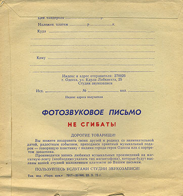 Pic. 5-1. One-sided flexible photo-record (both sides are shown) measuring 7.6" x 6.3" (19.4 x 16.0 cm), with the song Mrs Vandebilt by Paul McCartney and Wings. Neither the song's title, nor the artists are listed on the record. Rotation speed is 33 1/3 rpm. Also a special paper postal envelope (both sides are shown), measuring 7.1" x 8.9" (18.0 x 22.6 cm) is presented, in which this photo-record was found. According to the printing works' imprint stated on the non-working side of the photo-record, it was purchased not earlier than 1976. Рис. 5-1. Односторонняя гибкая фотопластинка (показаны обе стороны) размером 19,4 х 16,0 см (в дюймах – 7,6" х 6,3"), с песней Mrs Vandebilt в исполнении Пола Маккартни и группы "Крылья" ("Wings"). Ни название песни, ни исполнитель на пластинке не указаны. Скорость вращения – 33 1/3 об/мин. Также представлен специальный бумажный почтовый конверт (показаны обе стороны), размером 18,0 х 22,6 см (в дюймах – 7,1" х 8,9"), в котором была найдена эта пластинка. Судя по выходным данным типографии, указанным на нерабочей стороне фотопластинки, она была куплена не ранее 1976 года. |