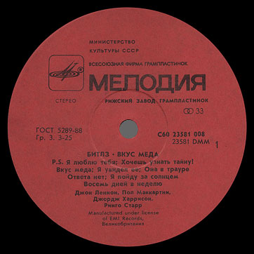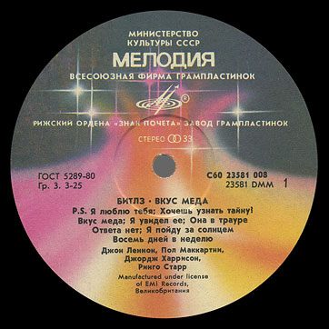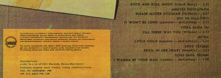 Sleeves of Riga Plant, which have var. f of the back side, show the manufacturer as "«RiTonis» manufacturing firm". Found copy of the edition with this variation of the back side of the sleeve was supplied with LP carrying labels of var. white-4. Latvian "РиТонис" (or "RiTonis") company (firm) was established on the basis of Melodiya's former Riga Plant approximately in the beginning of 90s.