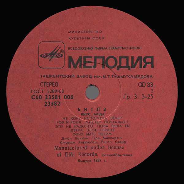 Pic. 6. LP labels of the mispressed edition of A TASTE OF HONEY album by Tashkent Plant released in the beginning of 90s