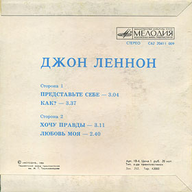 Imagine (Представьте себе) – the actual running time shortened to 2:59 (2 seconds less – original album shows 3:01 for this song), Melodiya's sleeve shows 3:04.