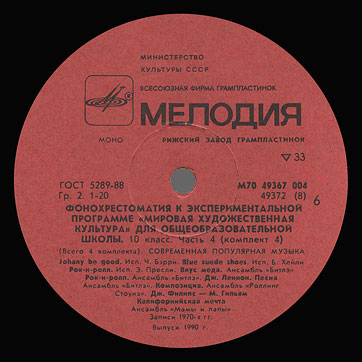 The Beatles – PHONO-READER FOR THE «WORLD ARTISTIC CULTURE» EXPERIMENTAL COURSE FOR GENERAL EDUCATION SCHOOL. 10-th FORM. PART 4 (SET 4). Record 3