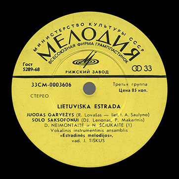 One variation of title sleeve by Riga Plant has been found (var. 1) – liner notes on the back side are presented both in Lithuanian and in Russian. Record title in Lithuanian language is LIETUVIŠKA ESTRADA, title of the Beatles cover in Lithuanian language is Solo Saksofonui.