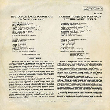 These sleeves were manufactured in Lithuania by VAIZDAS printing works. Liner notes and tracklist on them are stated in two languages simultaneously: in Lithuanian and in Russian, cover version of The Beatles composition in Lithuanian is listed as Džaivas [see Pic. 2]. Record title is listed additionally in Lithuanian as well – PRAMOGINIAI ŠOKIAI KONKURSAMS IR ŠOKIŲ VAKARAMS. As it is stated, R. Booyvidas (R. Buivydas – in Lithuanian) was the designer of these sleeve variations.