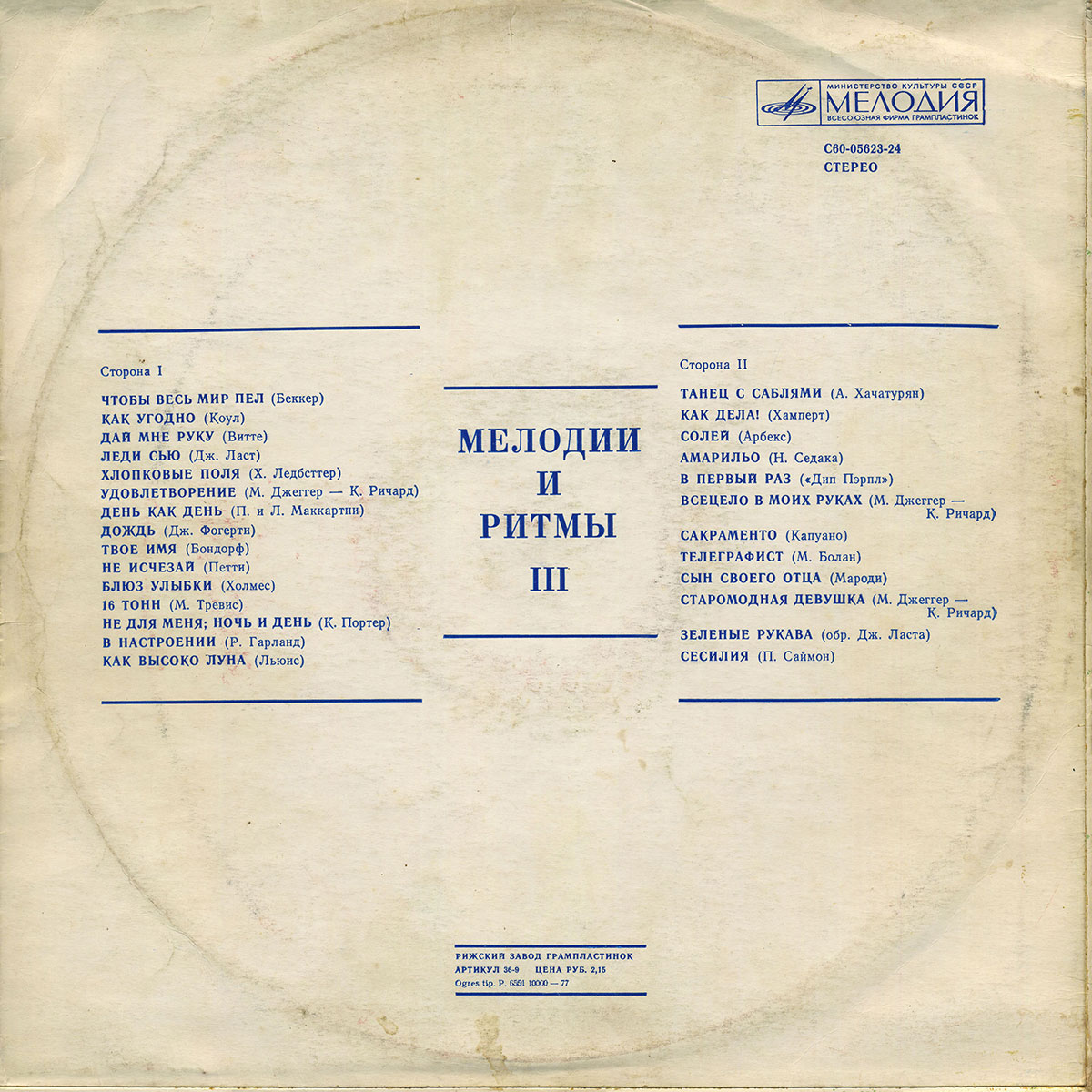 Considering the fact that number "1977" is present in the design of front side of the sleeves of var. 2a, var. 2b, var. 2c, var. 2d, var. 2e, var. 2f, it is fair to assume that the sleeve of this style initially appeared in 1977. Also it can be observed that the front sides of these sleeve variations show album title as MELODIES AND RHYTHMS № 3 but not MELODIES AND RHYTHMS (III).