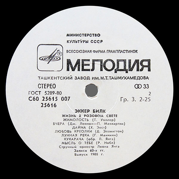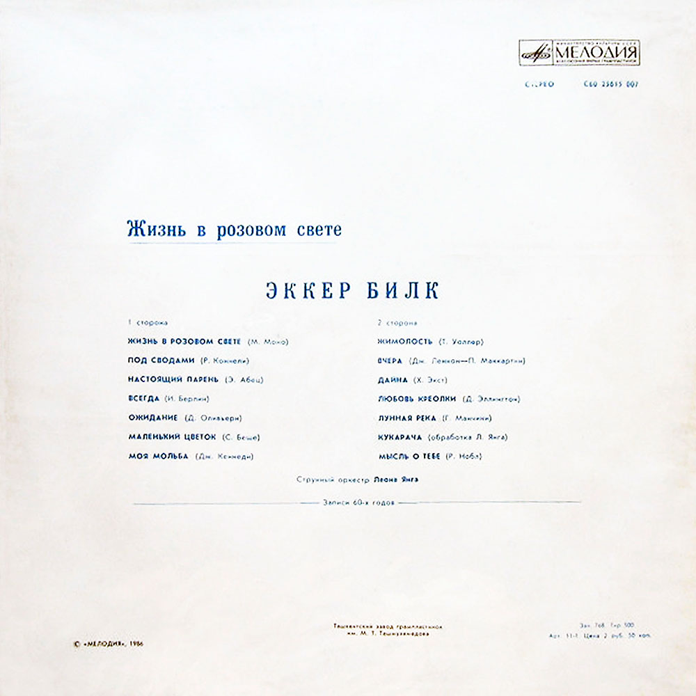 To date only one variation of the sleeve by Tashkent Plant has been found. It's a title sleeve which shows the following imprint (listed in the lower part of the back side): 1988, order # – 768, printing run – 500 copies.