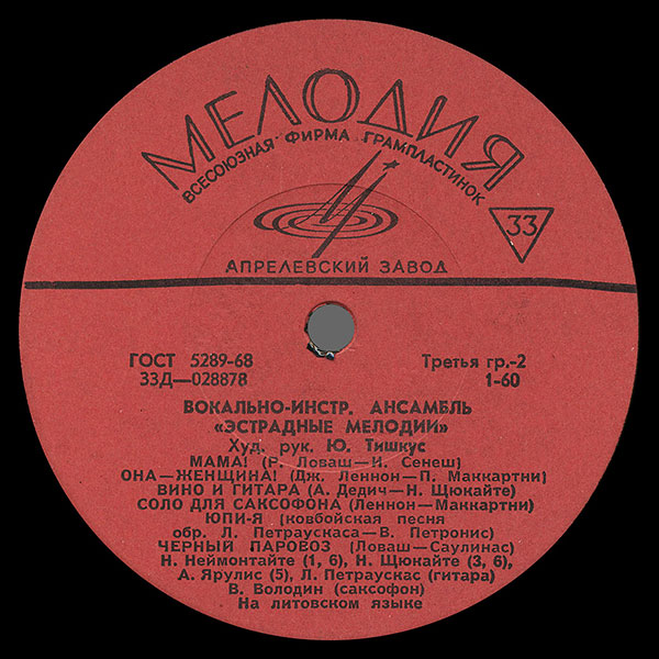 На этикетках вар. red-1 название пластинки указано с частичным сокращением: ВОКАЛЬНО-ИНСТР. АНСАМБЛЬ «ЭСТРАДНЫЕ МЕЛОДИИ».