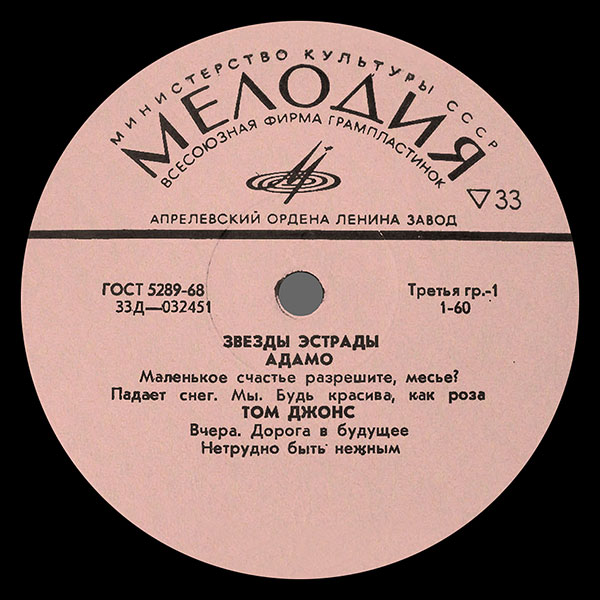 Several variations of title sleeve by Aprelevka Plant for this 12" LP have been found. All of them have nearly the same back side.