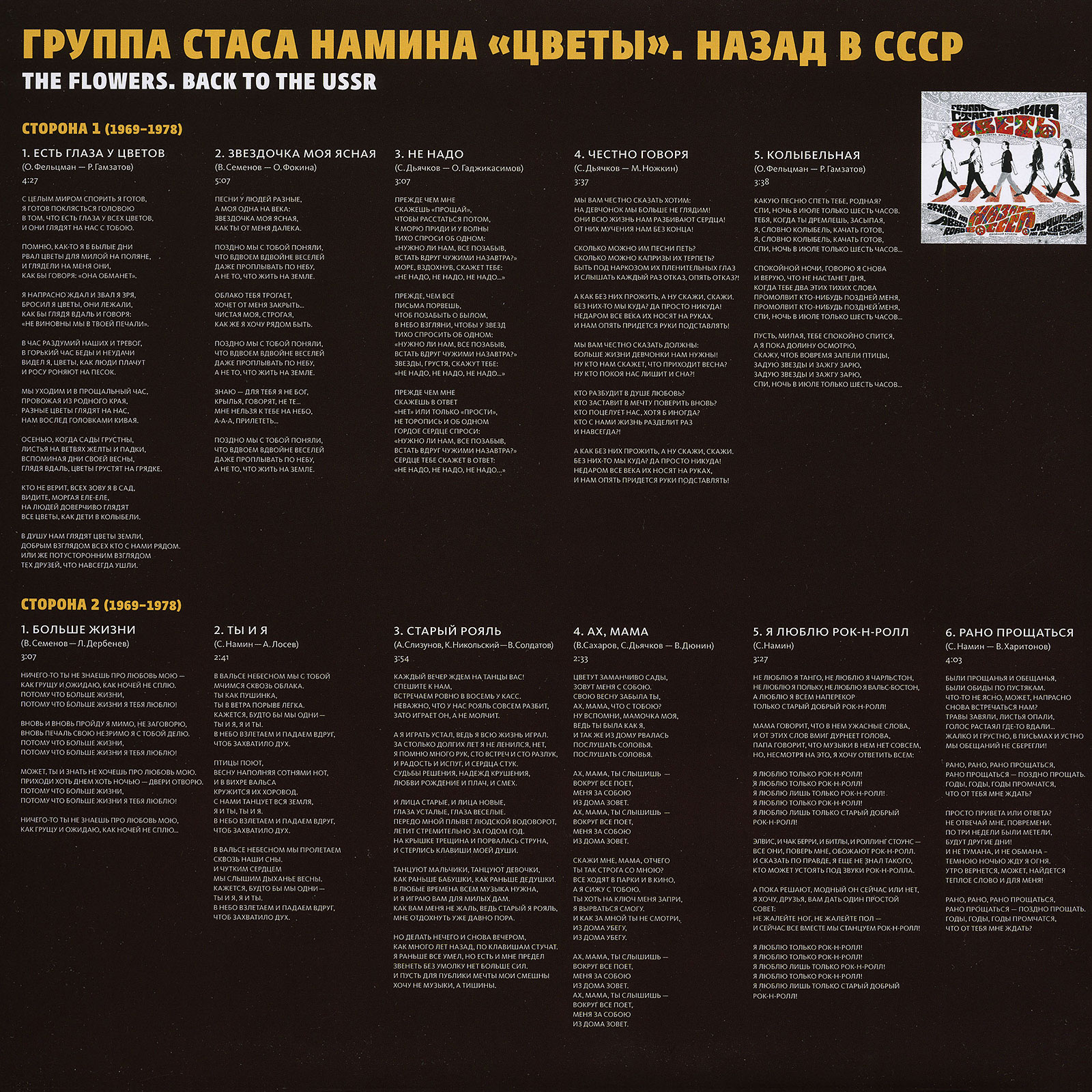 Этот двойной альбом группы Стаса Намина "Цветы" под названием НАЗАД В СССР (издан в честь 40-летия коллектива) имеет отношение к битловской теме по следующим причинам: