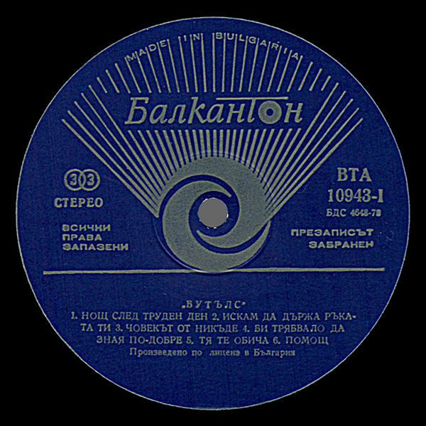 This 12"LP is entirely compiled of The Beatles cover versions sung by the British group The Bootles (from Liverpool) and is titled after the band's name. In Bulgarian – Бутълс.
