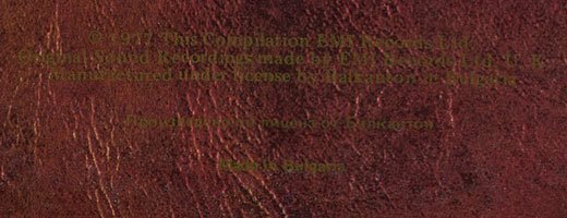 Предположительно, фирма "Балкантон" сначала печатала коричневые обложки (вар. 1). И похоже, что для изготовления этих разворотных обложек она использовала экземпляр оригинальной британской разворотной обложки, на оборотной стороне которой очень искусно были заретушированы все надписи золотистого цвета и нанесены перечни песен на болгарском и английском языках печатными знаками того же цвета, но более крупного размера. По каким-то причинам были оставлены нетронутыми надписи жёлтого цвета: "PCSP 721" (оригинальный каталожный номер, указанный в нижней части корешка), "Available on tape" и "Made and printed in Great Britain" (в нижней части оборотной стороны). Позже их тоже заретушировали, но на этот раз это было сделано не очень аккуратно – на некоторых экземплярах болгарских обложек отчётливо (или не очень) видны следы данной работы [см. Рис. 4].