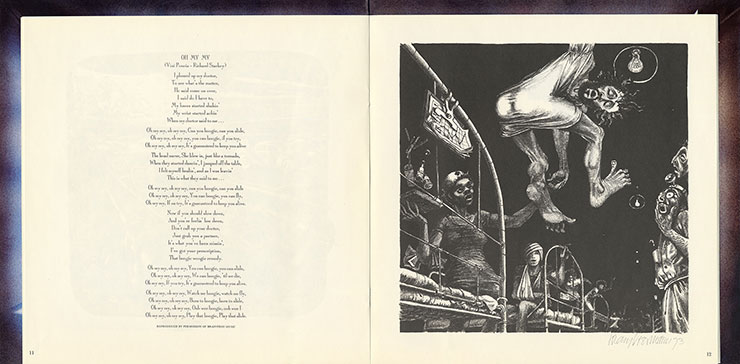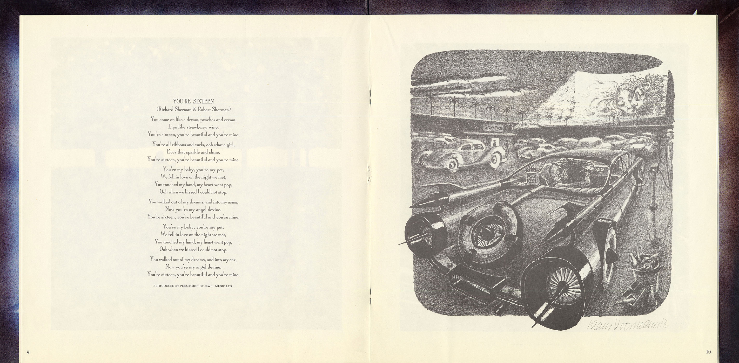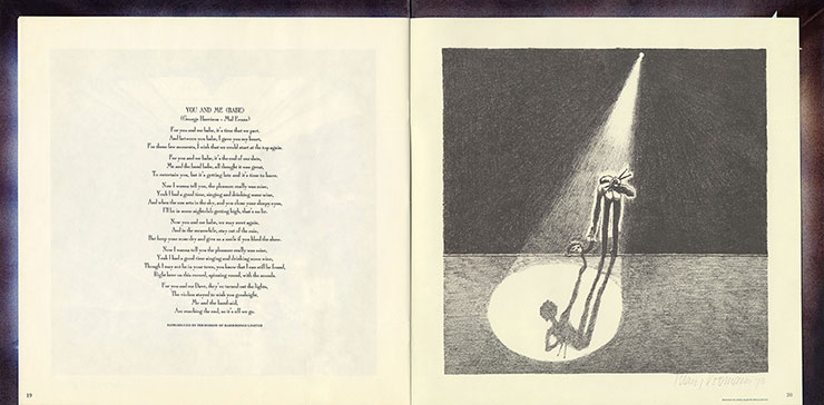 Non-laminated gatefold cover. 'Sgt. Pepper' style cover art by Tim Bruckner. The album was packaged with a 24-page 29,8 x 29,8 cm (11,7 x 11,7 inch) booklet featuring album credits, song lyrics and Klaus Voormann lithographs depicting each of the songs. The booklet carries on a joke from George Harrison's Living In The Material World LP by providing information on the Jim Keltner Fan Club. Fans are advised to send a stamped undressed envelope to the address for Capitol Records in Hollywood.