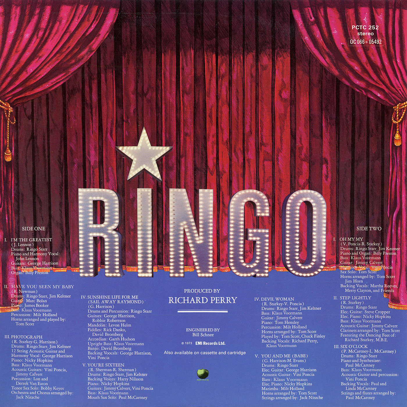 I. I'M THE GREATEST Drums: Ringo Starr Piano and Harmony Vocal: John Lennon Guitars: George Harrison Bass: Klaus Voormann Organ: Billy Preston II. HAVE YOU SEEN MY BABY Drums: Ringo Starr, Jim Keltner Guitar: Marc Bolan Piano: James Booker Bass: Klaus Voormann Percussion: Milt Holland Horns arranged and played by: Tom Scott III. PHOTOGRAPH Drums: Ringo Starr, Jim Keltner 12 String Acoustic Guitar and Harmony Vocal: George Harrison Piano: Nicky Hopkins Bass: Klaus Voormann Acoustic Guitars: Vini Poncia, Jimmy Calvert Percussion: Lon and Derrek Van Eaton Tenor Sax Solo: Bobby Keyes* Orchestra and Chorus arranged by: Jack Nitzche IV. SUNSHINE LIFE FOR ME (SAIL AWAY RAYMOND) Drums and Percussion: Ringo Starr Guitars: George Harrison, Robbie Robertson Mandolin: Levon Helm Fiddles: Rick Danko, David Bromberg Accordion: Garth Hudson Upright Bass: Klaus Voormann Banjo: David Bromberg Backing Vocals: George Harrison, Vini Poncia V. YOU'RE SIXTEEN Drums: Ringo Starr, Jim Keltner Backing Voices: Harry Nilsson Piano: Nicky Hopkins Guitars: Jimmy Calvert, Vini Poncia Bass: Klaus Voormann Mouth Sax Solo: Paul McCartney |
