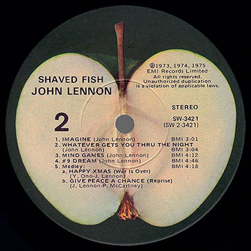 John's last record released on the Apple label, is a collection of his greatest hits, which were edited/shortened by John himself. John later named the collection Shaved Fish after a brand of Japanese cigarettes. It was also a pun in that several of the songs were "shaved" to reduce their running time for the LP.
