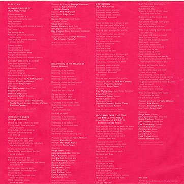 1. PRIVATE PROPERTY Acoustic Guitar, Electric Guitar – Lawrence Tuber Backing Vocals [Background Vocals] – Lezlee Livrano Pariser, Linda McCartney, Paul McCartney, Sheila Casey Engineer – Peter Henderson Saxophone [Saxes] – Howie Casey 2. WRACK MY BRAIN Backing Vocals [Background Vocals] – George Harrison, Ray Cooper Bass, Tuba – Herbie Flowers Engineer – Phil McDonald Piano, Electric Guitar – Al Cooper Piano, Percussion, Synthesizer, Lead Guitar – Ray Cooper Producer [Assisted By] – Phil McDonald, Ray Cooper 3. DRUMMING IS MY MADNESS Arranged By [Arranger] – Van Dyke Parks Baritone Saxophone [Baritone Sax] – Jim Gordon Bass – Dennis Belfield Drums – Jim Keltner Engineer – Rick Riccio Flute – Rick Riccio Guitar – Dennis Budimir, Fred Tacket, Ritchie Zito Piano – Jane Getz Tenor Saxophone [Tenor Sax] – Jerry Jammonville Trombone – Bruce Paulson Trumpet – Lee Thornburg 4. ATTENTION Backing Vocals [Background Vocals] – Lezlee Livrano Pariser, Linda McCartney, Sheila Casey Engineer – Peter Henderson Guitar [Guitars] – Lawrence Tuber Saxophone [Saxes] – Howie Casey 5. STOP AND TAKE THE TIME TO SMELL THE ROSES Arranged By [Arranger] – Van Dyke Parks Baritone Saxophone [Baritone Sax] – Jim Gordon Bass – Dennis Belfield Drums – Jim Keltner Engineer – Rick Riccio Guitar – Dennis Budimir, Fred Tacket, Ritche Zito Mixed By – Harry Nilsson Piano – Jane Getz Tenor Saxophone [Tenor Sax] – Jerry Jummonville Trombone – Bruce Paulson Trumpet – Lee Thornburg |